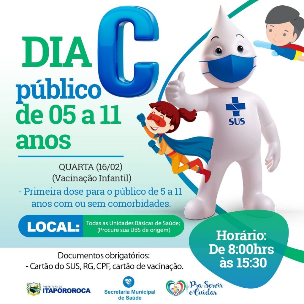 A Prefeitura Municipal de Itapororoca, através da Secretaria Municipal de Saúde, informa que nesta quarta-feira (16/02), estará realizando um dia "C" de vacinação contra Covid-19, para o público de 05 a 11 anos, conforme programação a seguir: