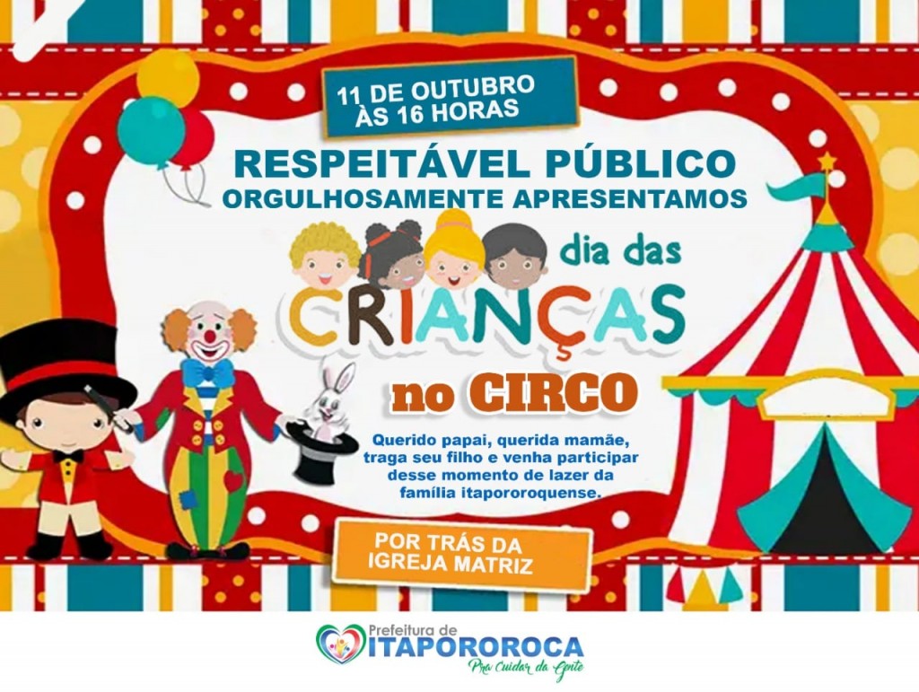 A Prefeitura de Itapororoca-PB , convida toda a sociedade itapororoquense para a Grande Festa das Crianças no Circo.