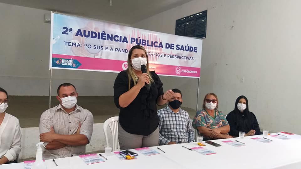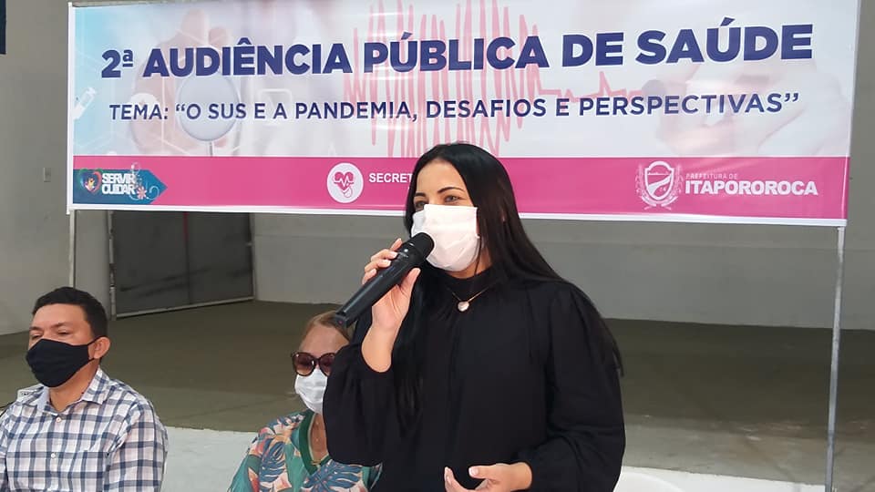A prefeita, Elissandra Brito, em seu discurso abordou a importância da realização deste evento para a sociedade itapororoquense. “ A nova estrutura para enfrentarmos os novos desafios da área da saúde com o plano municipal é uma grande missão, o preparo, a dedicação de cada um servidor, dos poderes constituídos e da sociedade civil, será crucial para podermos por em prática aquilo que será proposto e aprovado nessa audiência. O que sugerirmos durante esta audiência pública é fundamental para os próximos anos. Nesta oportunidade, gostaria de agradecer a cada profissional de saúde que está na linha de frente nesse momento pandemico, vocês são verdadeiros heróis e heroínas. Com muito esforço e quase 17 meses depois do 1° caso confirmado de COVID_19 em solo itapororoquense, conseguimos zerar nessa semana os casos em Itapororoca, a vocês um fraterno abraço.” Argumentou Elissandra Brito.