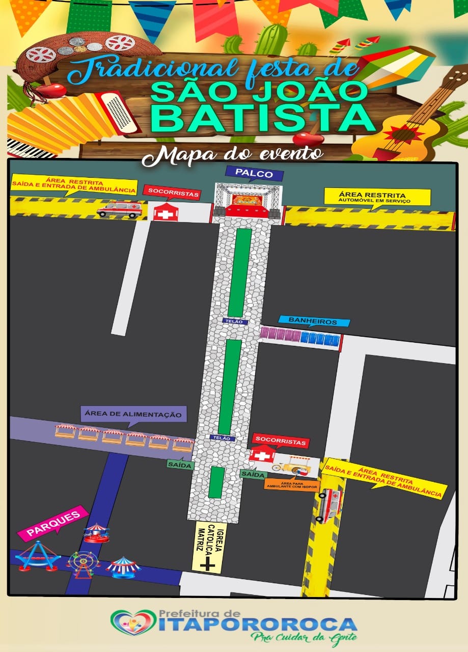 Objetivando um maior conforto, segurança e orientação da sociedade itapororoquense e dos Turistas que irão comparecer a Tradicional Festa do Padroeiro São João Batista nos dias 21/22/23/24 e 25 de Junho, a Prefeitura Municipal de Itapororoca-PB inova e elabora mapa do espaço de realização do evento.