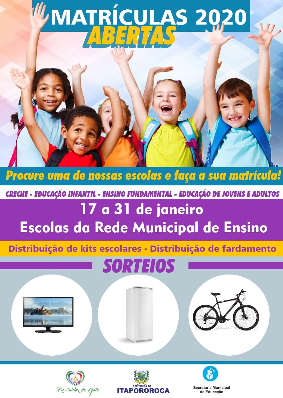 Atenção senhores país, alunos e comunidade em geral , a Prefeitura Municipal de Itapororoca, através de sua Secretaria de Educação, informa que a partir de sexta-feira dia 17/01 até dia 31/01, estarão abertas as matriculas referente ao ano letivo de 2020.