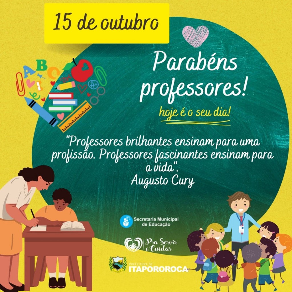. Eu, como Professora sei o quanto estes profissionais educadores são importantes. Eu, como aluna nunca me esqueci dos Professores que me ensinaram desde a infância até a conclusão do curso de graduação e mestrado.Neste dia especial (15/10), cada professor e professora sintam-se abraçados por nossa Gestão "Pra Servir e Cuidar" na pessoa da Prefeita, Elissandra Brito, e pelo Secretário Municipal de Educação, Professor Jhef Costa.