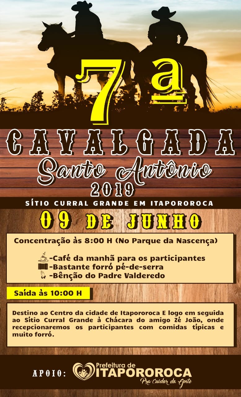 A Prefeitura de Itapororoca, com apoio de amigos, realizará a VII Cavalgada de Santo Antônio do Sítio Curral Grande . O evento já é uma tradição em toda região e acontecerá no dia 09 de junho (domingo), a partir das 8 horas, com concentração e saída será no Parque da Nascença , partindo as 10 horas com destino a "Fazenda Curral Grande" Chácara do nosso amigo Zé João. O percurso será de aproximadamente 10 quilômetros, segundo os organizadores.