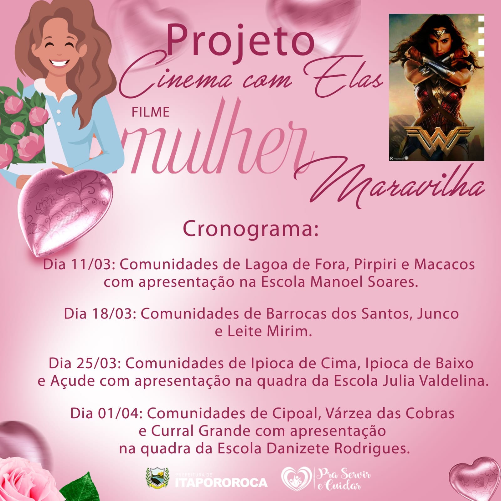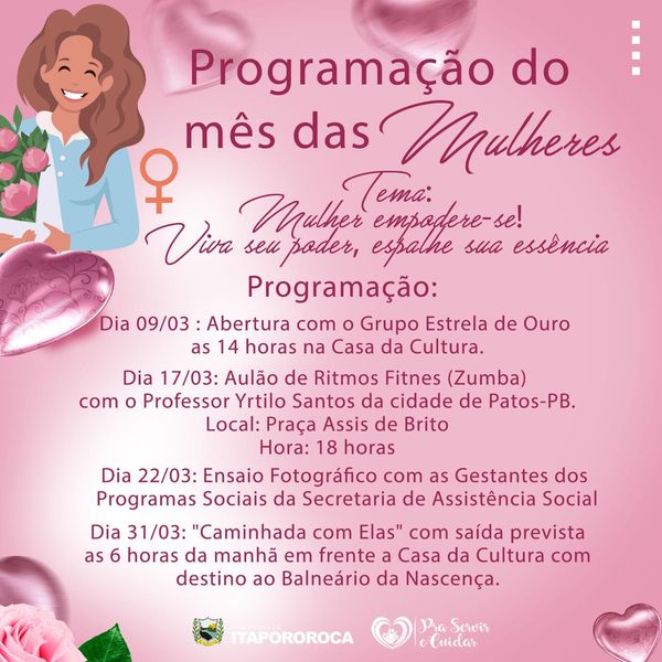 A Prefeitura de Itapororoca-PB, por intermédio de sua Secretaria Executiva de Políticas Públicas Para as Mulheres tem a honra de convidar toda sociedade itapororoquense para juntos participarmos dos eventos alusivos ao mês das mulheres.