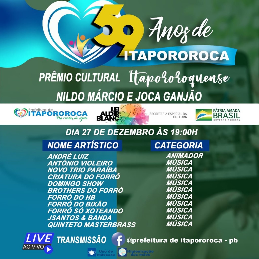 O projeto tem sua efetivação através do Governo Federal "Lei Aldir Blanc", e Itapororoca é uma das cidades contempladas.