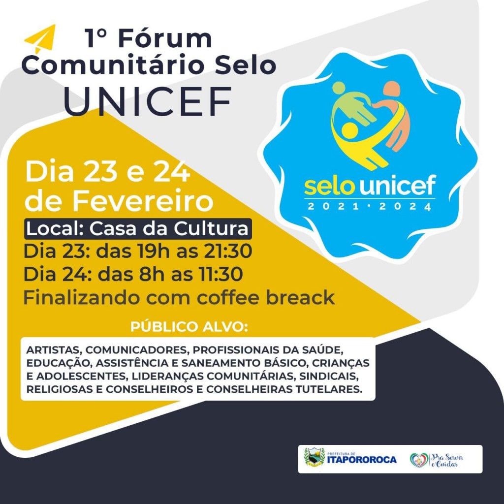A Prefeitura de Itapororoca, por meio do CMDCA, da Secretaria Municipal de Assistência Social, Secretaria Municipal de Saúde e Secretaria de Educação, convida toda a população itapororoquense para juntos participarmos do 1º Fórum Comunitário do Selo UNICEF, Município Aprovado na última edição. O Selo UNICEF é uma iniciativa que tem como objetivo contribuir com a redução das desigualdades e a garantia dos direitos das crianças e dos adolescentes do Semiárido e da Amazônia brasileira. Para isso, busca fortalecer a gestão municipal e qualificar as políticas públicas direcionadas à infância. Os Fóruns Comunitários são espaços de encontro, disseminação de informações e diálogo sobre as políticas públicas municipais. É nele que a comunidade analisa a situação das crianças e adolescentes, planeja e sugere ações, monitora e avalia o impacto das políticas sociais voltadas à infância e à adolescência.