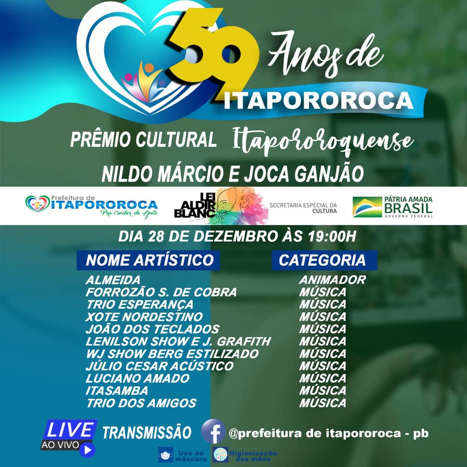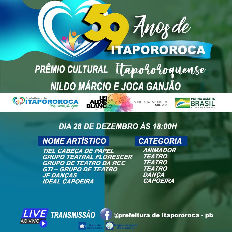 O projeto tem sua efetivação através do Governo Federal "Lei Aldir Blanc", e Itapororoca é uma das cidades contempladas.